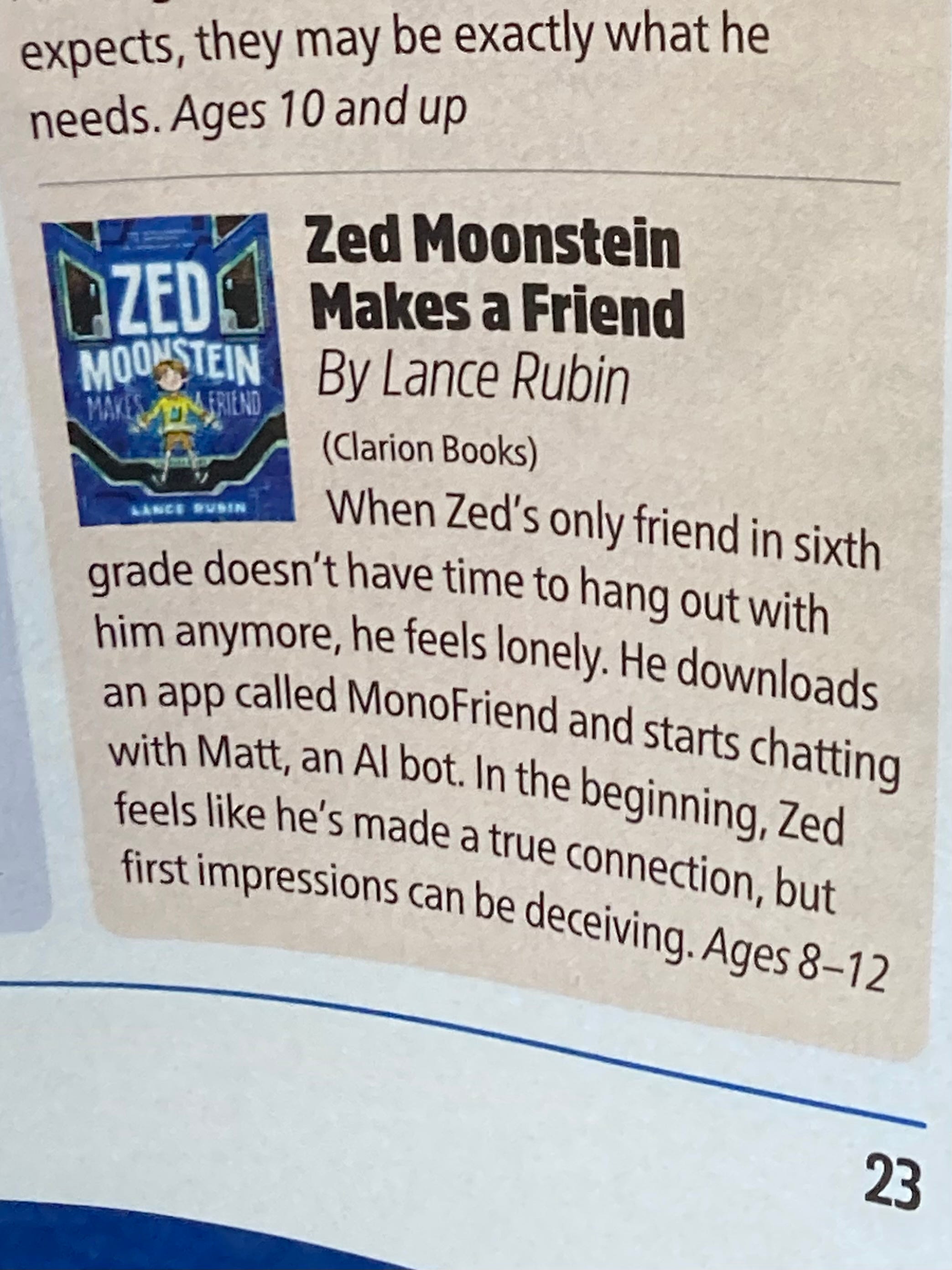 In other recent Zed news, the book made the pages of The Week Jr! Our kids have loved this magazine for years, so it was truly thrilling to see Zed Moonstein inside it. Big thanks to The Week Jr’s Books Editor, Karen Cicero, and to HarperCollins.