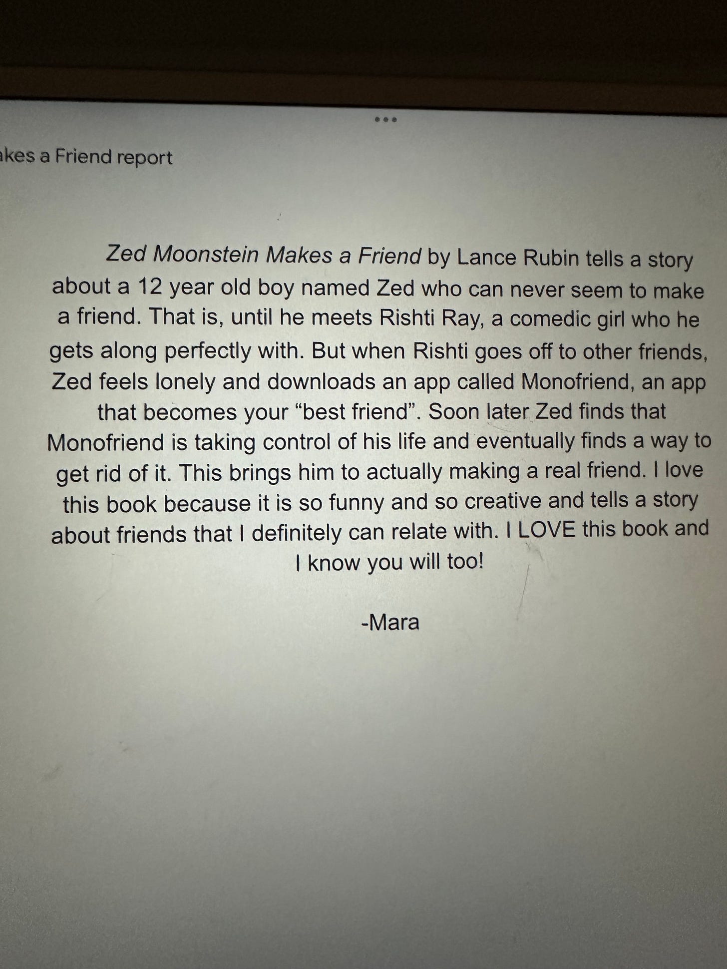 And ALSO: whether you were at the launch or not, thank you to everyone who’s been reading the book! And thank you to your kids for reading too! It’s really the most delightful thing to hear about kids staying up too late to read it, or being a little more afraid of AI after finishing it, or—in the case of my dear friends Jason and Molly’s 9-year-old daughter, Mara—being inspired to write a full-length review of it. (Which I’ve been given permission to share here:)